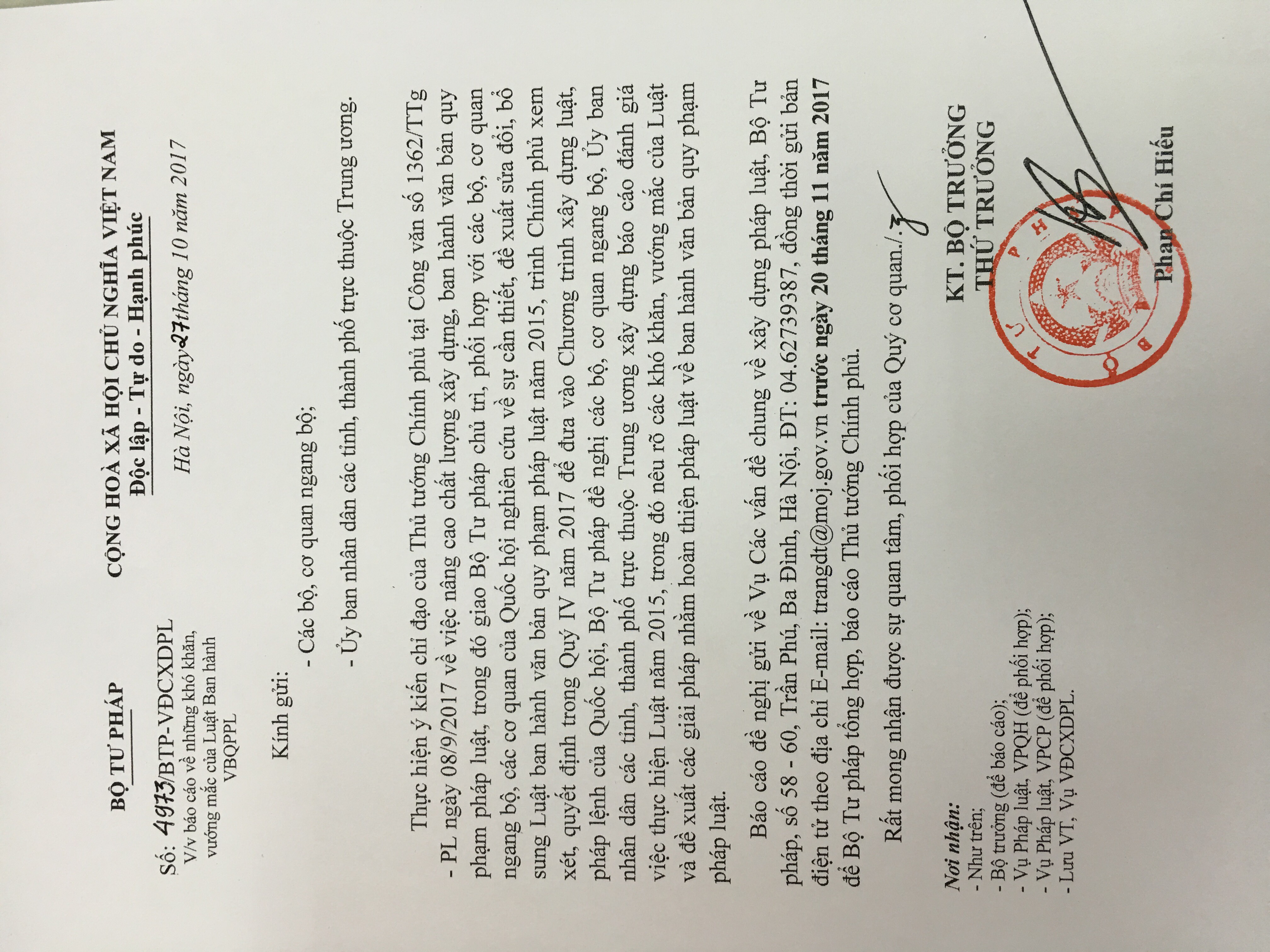 Thực hiện ý kiến chỉ đạo của Thủ tướng Chính phủ tại Công văn số 1362/TTg-PL về việc giao Bộ Tư pháp chủ trì, phối hợp với các bộ, cơ quan ngang bộ, các cơ quan của Quốc hội nghiên cứu sự cần thiết, đề xuất sửa đổi, bổ sung Luật Ban hành VBQPPL năm 2015, Bộ Tư pháp đề nghị các bộ, ngành, địa phương xây dựng báo cáo đánh giá việc thực hiện Luật năm 2015. Báo cáo gửi về Vụ Các vấn đề chung về xây dựng pháp luật, Bộ Tư pháp trước ngày 20/11/2017 để Bộ Tư pháp tổng hợp, báo cáo Thủ tướng Chính phủ. (Chi tiết xin xem tại Công văn gửi kèm theo Thông báo này).