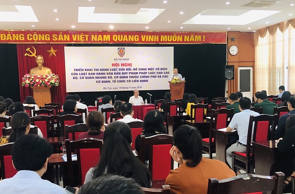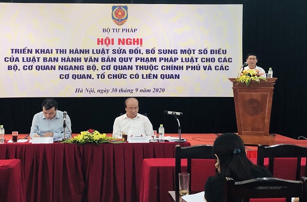 Thực hiện nhiệm vụ được giao tại Quyết định số 1323/QĐ-TTg ngày 31/8/2020 của Thủ tướng Chính phủ ban hành Kế hoạch triển khai thi hành Luật sửa đổi, bổ sung một số điều của Luật Ban hành văn bản quy phạm pháp luật và Quyết định số 1995/QĐ-BTP ngày 25/9/2020 của Bộ trưởng Bộ Tư pháp ban hành Kế hoạch triển khai thi hành Luật sửa đổi, bổ sung một số điều của Luật Ban hành văn bản quy phạm pháp luật của Bộ Tư pháp, ngày 30/9/2020, Bộ Tư pháp tổ chức Hội nghị “Triển khai thi hành Luật sửa đổi, bổ sung một số điều của Luật Ban hành văn bản quy phạm pháp luật cho các bộ, cơ quan ngang bộ, cơ quan thuộc Chính phủ và các cơ quan, tổ chức có liên quan”. Hội nghị có sự tham gia của đại diện tổ chức pháp chế các bộ, cơ quan ngang bộ, cơ quan thuộc Chính phủ; một số Tổng cục thuộc các bộ; đại diện Ủy ban Trung ương Mặt trận Tổ quốc Việt Nam và một số tổ chức thành viên, Kiểm toán nhà nước, Viện Kiểm sát nhân dân tối cao…; tổ chức pháp chế một số Tập đoàn, Tổng công ty nhà nước; đại diện một số cơ quan thông tấn, báo chí và một số đơn vị thuộc Bộ Tư pháp.