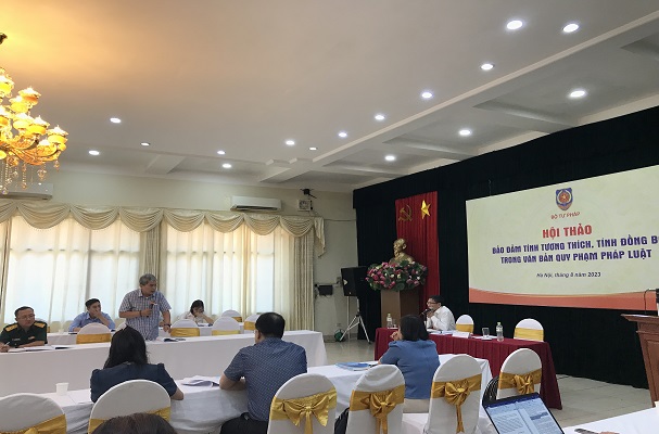 Ngày 08/8/2023, Bộ Tư pháp tổ chức Hội thảo bảo đảm tính tương thích, tính đồng bộ trong văn bản quy phạm pháp luật. Hội thảo có sự tham gia của công chức làm công tác xây dựng pháp luật đến từ các tổ chức pháp chế bộ, cơ quan ngang bộ, cơ quan thuộc Chính phủ và đại diện các đơn vị thuộc Bộ Tư pháp.