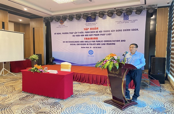 Tại Lớp tập huấn, đại diện học viên Lớp tập huấn, đồng chí Nguyễn Thị Ngân, Phó Chủ tịch Ủy ban Mặt trận tổ quốc tỉnh Quảng Ninh phát biểu lời cảm ơn tới Bộ Tư pháp và các giảng viên đã tổ chức lớp hợp vô cùng hữu ích cho cán bộ làm công tác lấy ý kiến và phản biện xã hội tại cơ sở và mong rằng Bộ Tư pháp và dự án UNDP tiếp tục tổ chức các Lớp tập huấn với mô hình tương tự để nâng cao kỹ năng cho cán bộ làm công tác xây dựng chính sách, soạn thảo văn bản quy phạm pháp luật.